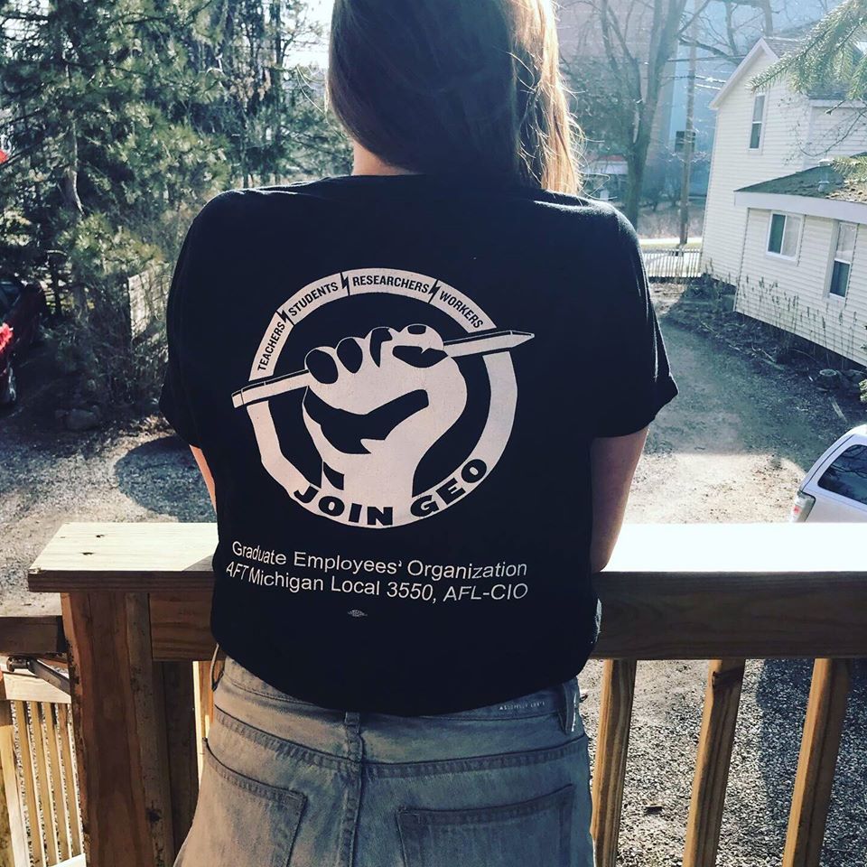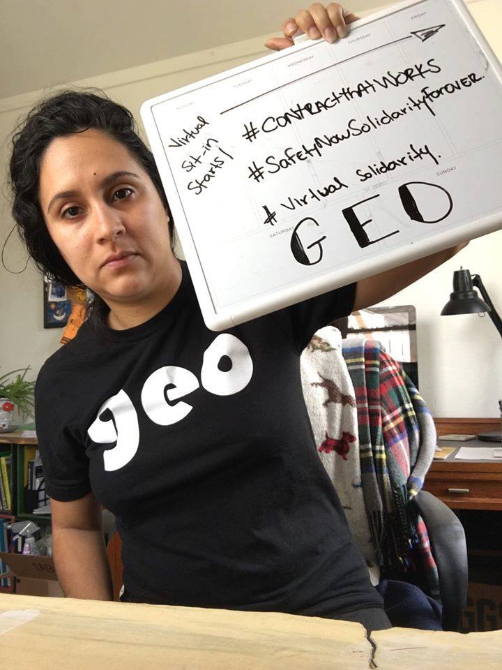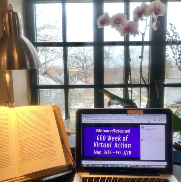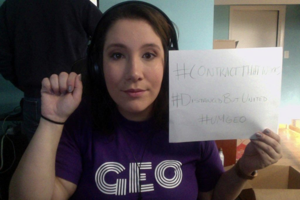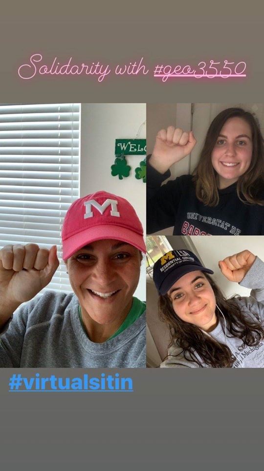 GEO takes the COVID-19 outbreak very seriously, and is innovating ways to continue to organize while social distancing. Starting today, we are conducting a Virtual Sit-In as one of several online actions that will take place over the course of this week to further GEO’s bargaining campaign. This time of crisis highlights the need for strong worker protections including medical leave, family leave, job security, health care coverage, GSI training, and more. As graduate students across U-M work hard to transform their courses for online learning and to conduct their research from home, we all remain energized to protect our benefits as workers and enhance the contract going forward. Below are images of our virtual sit-in, and you can see more on our Facebook page and head to our Twitter account to see what our members have to say. [email commchair@geo3550.org with a photo you’d like added to this album]